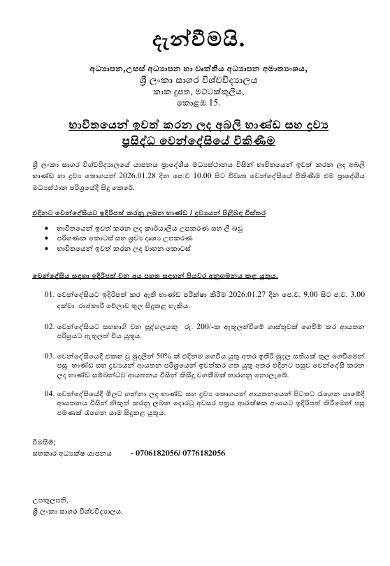 භාවිතයෙන් ඉවත් කරන ලද අබලි භාණ්ඩ හා ද්රව්ය ප්රසිද්ධ වෙන්දේසියේ විකිණීම (2026.01.28)