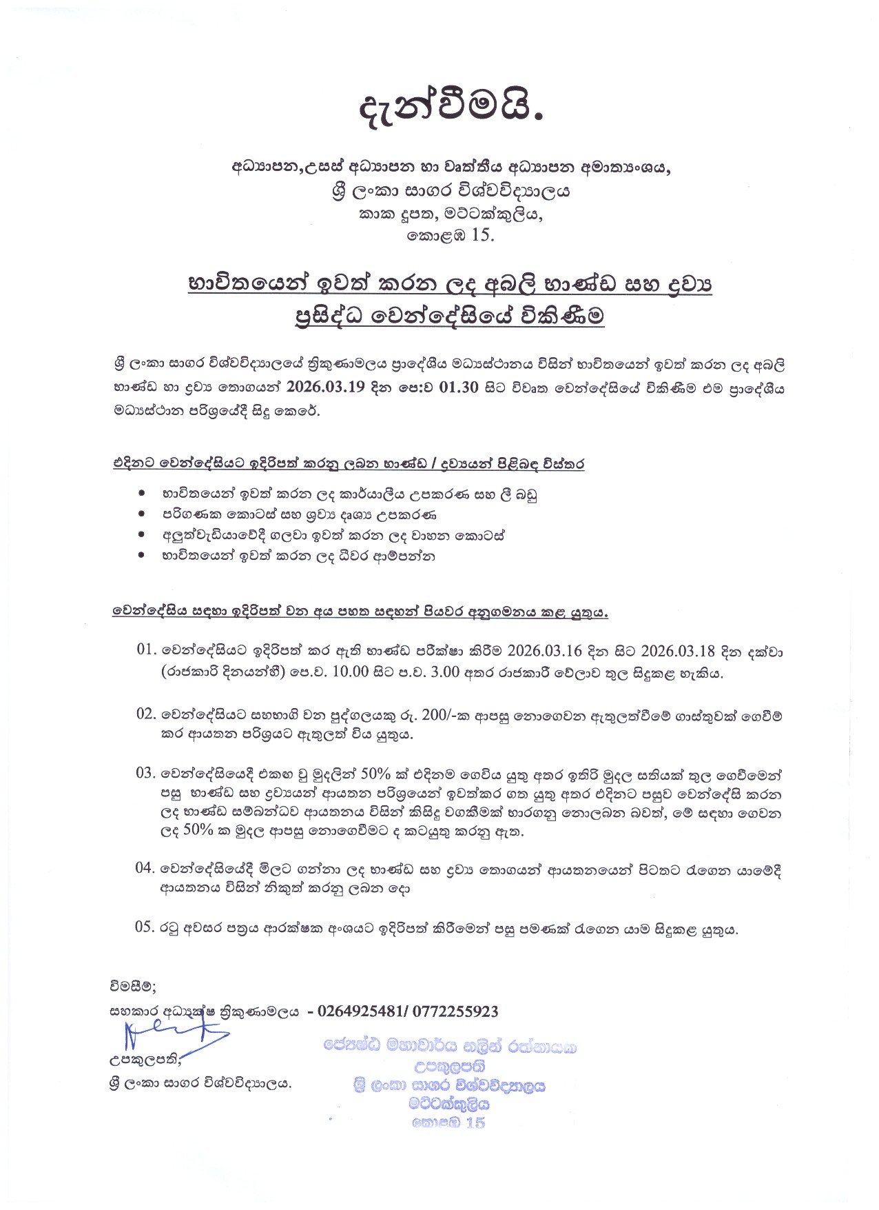 භාවිතයෙන් ඉවත් කරන ලද අබලි භාණ්ඩ හා ද්රව්ය ප්රසිද්ධ වෙන්දේසියේ විකිණීම (2026.03.19)