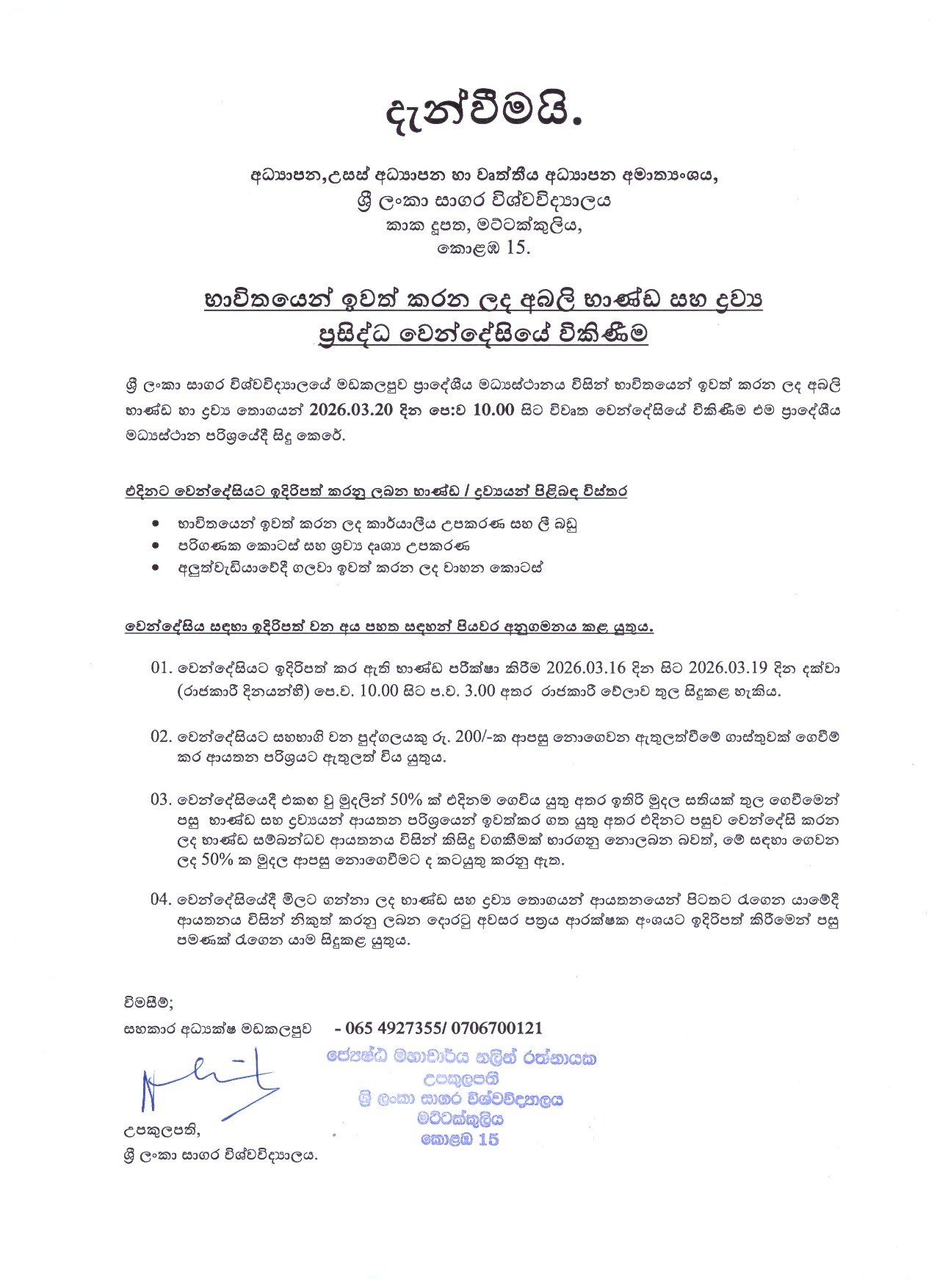 භාවිතයෙන් ඉවත් කරන ලද අබලි භාණ්ඩ හා ද්රව්ය ප්රසිද්ධ වෙන්දේසියේ විකිණීම (2026.03.20)